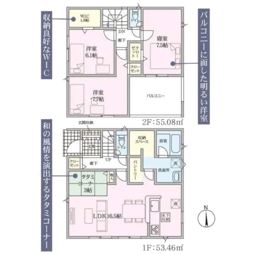 1階49.41㎡(14.94坪) 2階51.03㎡(15.43坪) 合計:100.44㎡(30.38坪) |