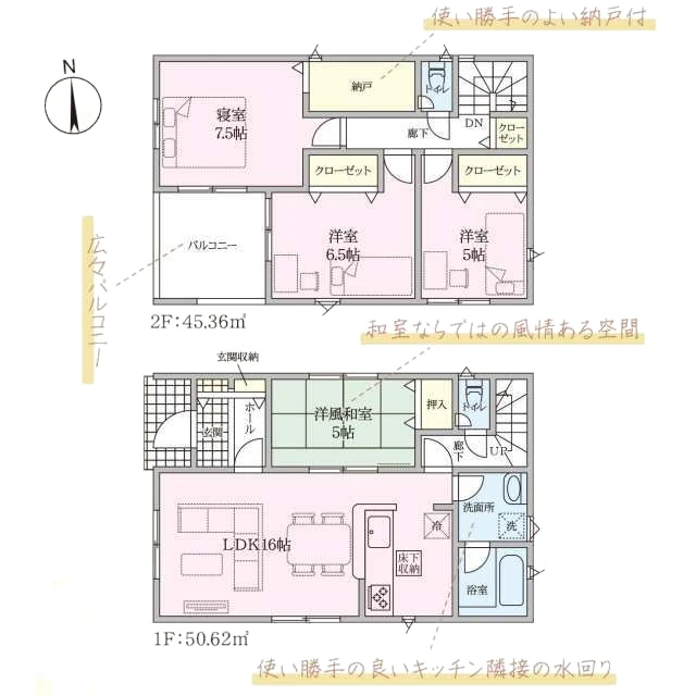 | 建物面積 | 【1号棟】1階49.41㎡(14.94坪) 2階44.55㎡(13.47坪) 合計:93.96㎡(28.42坪) 【2号地】1階51.84㎡(15.68坪) 2階46.17㎡(13.96坪) 合計:98.01㎡(29.64坪) 【3号棟】1階50.01㎡(15.12坪) 2階45.96㎡(13.90坪) 合計:95.97㎡(29.03坪) 【4号棟】1階50.62㎡(15.31坪) 2階45.36㎡(13.72坪) 合計:95.98㎡(29.03坪) 【5号棟】1階51.03㎡(15.43坪) 2階46.17㎡(13.96坪) 合計:97.20㎡(29.40坪) |
