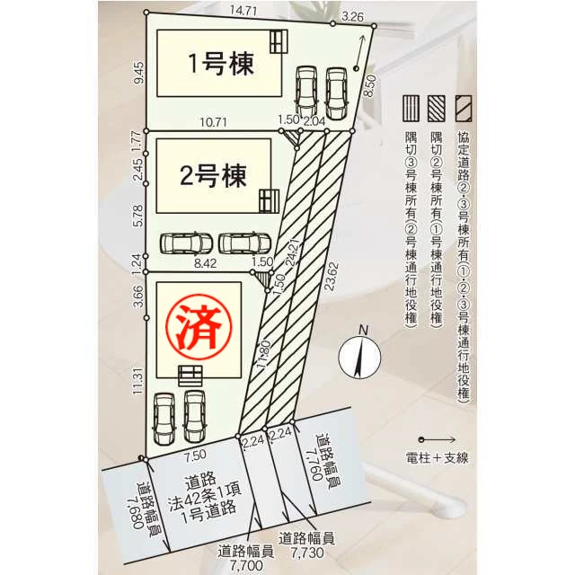 | 土地面積 | 【1号棟】201.05㎡(60.81坪) 【2号棟】174.02㎡(52.64坪) 【3号棟】済 |