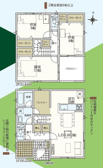 | 建物面積 | 【1号棟】1階50.22㎡(15.19坪) 2階51.84㎡(15.68坪) 合計:102.06㎡(30.87坪) | ||
