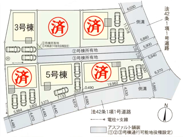 | 接道 | 【1号棟】済 【2号棟】済 【3号棟】東6.0m 【4号棟】済 【5号棟】南4.5m 【6号棟】済 |
