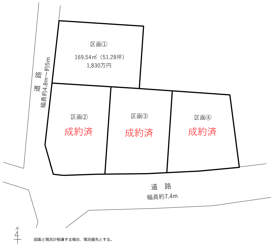 | 価格 | 区画① 1,830万円 区画② 成約済 区画③ 成約済 区画④ 成約済 | 面積 | 区画① 169.54㎡(51.28坪) 区画② 成約済 区画③ 成約済 区画④ 成約済 |