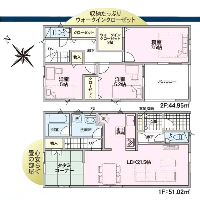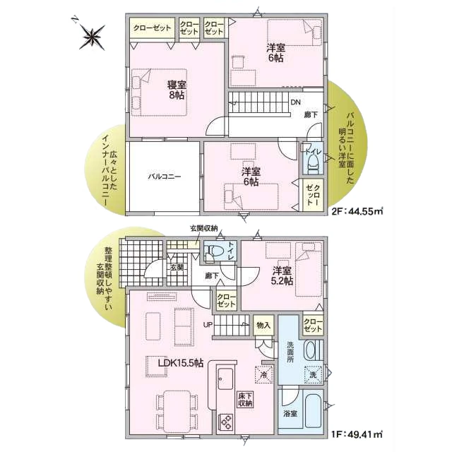 | 建物面積 | 【1号棟】済 【2号棟】済 【3号棟】1階51.02㎡(15.43坪) 2階44.95㎡(13.59坪) 合計:95.97㎡(29.03坪) 【4号棟】1階51.03㎡(15.43坪) 2階44.55㎡(13.47坪) 合計:95.58㎡(28.91坪) 【5号棟】1階49.41㎡(14.94坪) 2階44.55㎡(13.47坪) 合計:93.96㎡(28.42坪) |