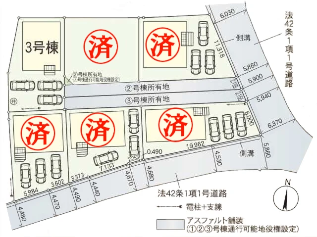 | 接道 | 【1号棟】済 【2号棟】済 【3号棟】東6.0m 【4号棟】済 【5号棟】南4.5m 【6号棟】済 |