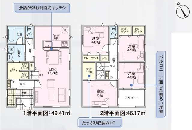 建物面積 | 【1号棟】1階49.41㎡(14.94坪) 2階46.17㎡(13.96坪) 合計:95.58㎡(28.91坪) 【2号地】済 【3号地】済 【4号地】済 |