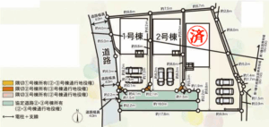 接道 | 【1号地】済 【2号棟】北4.2m 西5.3m 【3号棟】北4.4m 西5.3m 【4号地】済 【5号地】済 |