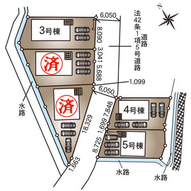 | 接道 | 【1号棟】済 【2号棟】済 【3号棟】南東6.0m 【4号棟】北西6.0m 【5号棟】北西6.0m |