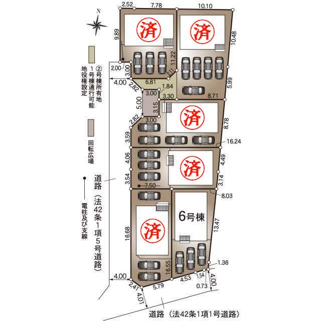 | 接道 | 【1号地】済 【2号地】済 【3号地】済 【4号地】済 【5号棟】済 【6号棟】南4.0m |